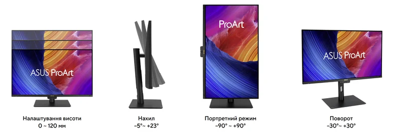 Спеціально розроблена підставка монітора ProArt дозволяє гнучко регулювати кут нахилу та висоту екрана, а також повертати його та переводити в портретний режим, щоб забезпечити ідеальне положення для перегляду. Можливість обертати екран на 90° (за годинниковою стрілкою або проти неї), переводячи його в портретний режим, стане у пригоді під час роботи з плакатами, афішами та іншими великоформатними проєктами. Підставку можна швидко зняти без використання інструментів, щоб потім закріпити монітор на стіні за допомогою VESA-сумісного кронштейна.