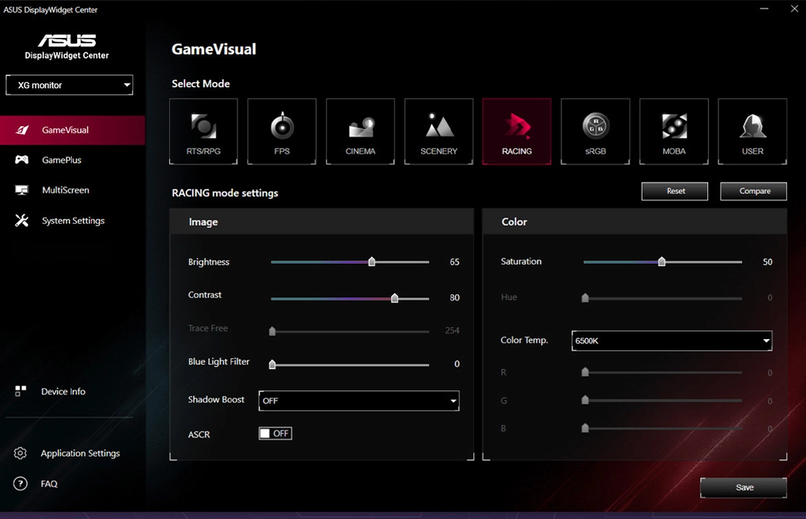 Програма ASUS DisplayWidget Center дозволяє налаштовувати режими зображення, колірну температуру, контраст, яскравість і додаткові функції безпосередньо з Windows без користування фізичними кнопками монітора.