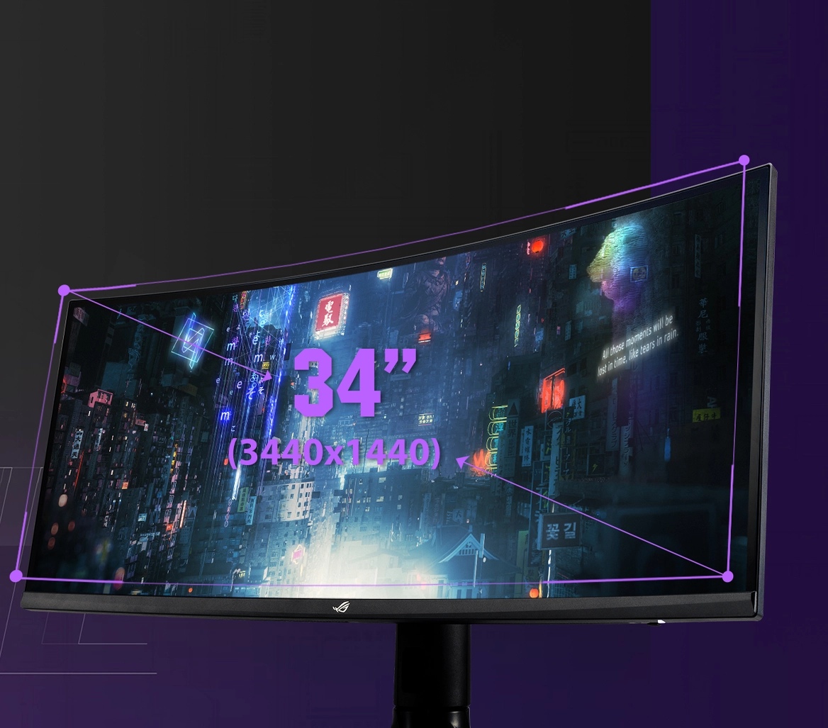 ROG Strix XG349C оснащений 34-дюймовою вигнутою панеллю з роздільною здатністю 3440×1440 . Завдяки широкому формату 21:9 монітор забезпечує кінематографічний ефект та повне занурення у віртуальні світи.