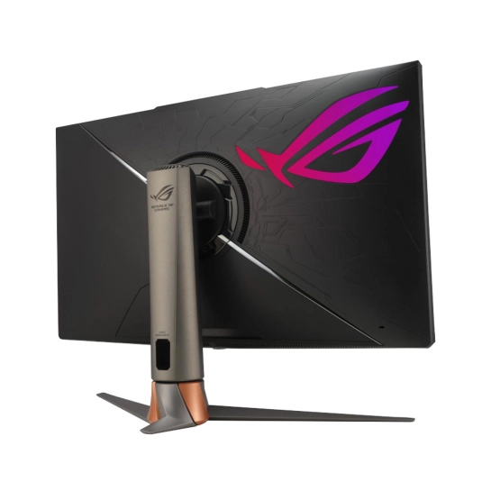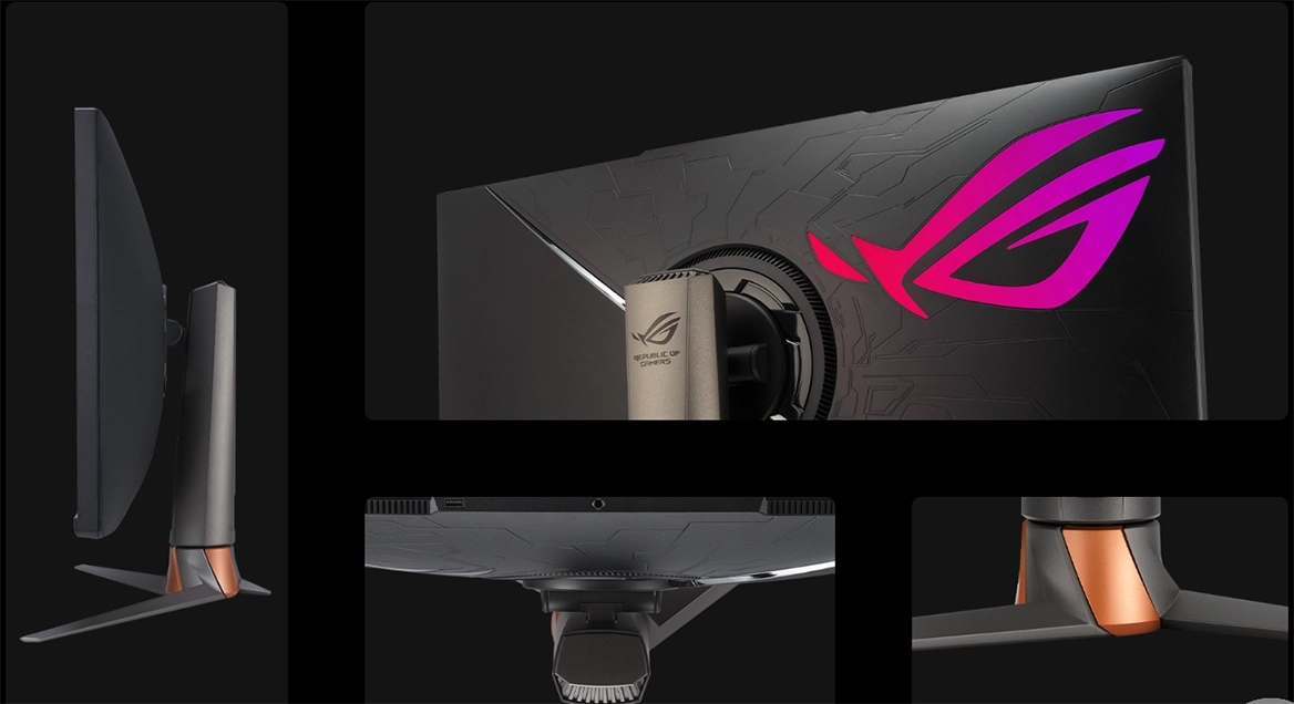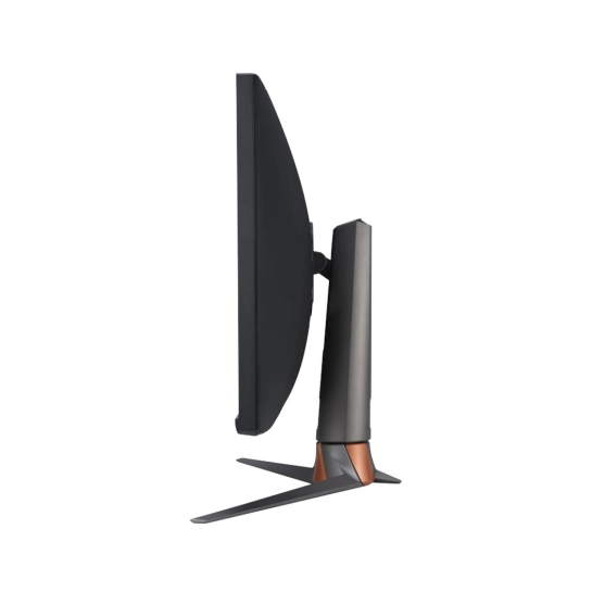Ергономічний корпус із фірмовим логотипом ROG та мідними акцентами створює відчуття преміальності. Монітор підтримує регулювання по висоті, нахилу та повороту, що дозволяє налаштувати його під себе для максимального комфорту під час ігрових сесій.