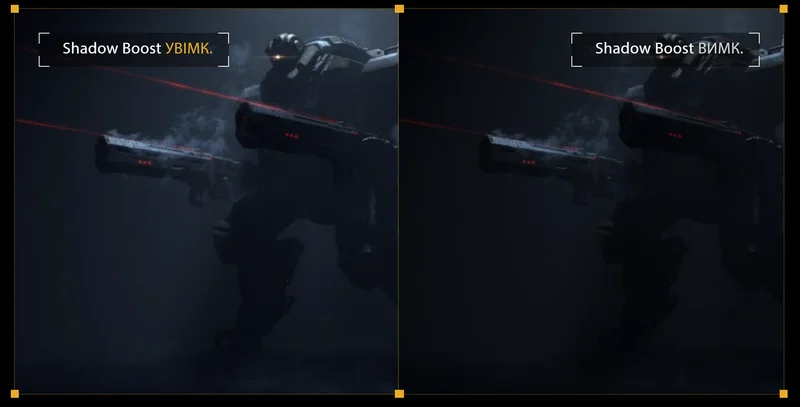 Технологія ASUS Shadow Boost покращує чіткість темних фрагментів ігрових сцен без впливу на більш яскраві ділянки. Це дозволить швидше помітити ворога, який зачаївся в тіні.