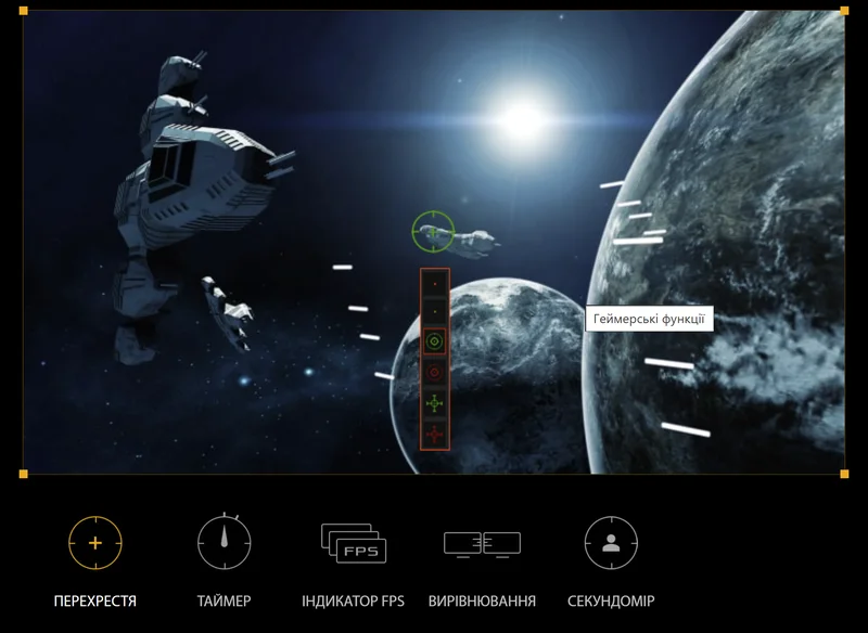 В ігрових моделях моніторів ASUS реалізовано низку ексклюзивних функцій для шанувальників комп’ютерних ігор, які активуються за допомогою кнопки GamePlus. Ці функції, розроблені з урахуванням відгуків професійних геймерів, дають змогу гравцям тренувати й удосконалювати свої ігрові навички.