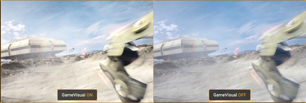 Технологія ASUS GameVisual пропонує вісім попередньо встановлених режимів відображення для оптимізації візуальних ефектів під різні типи контенту. Перемикайтеся між режимами, такими як Racing, FPS, MOBA, Cinema, Scenery, sRGB, RTS/RPG та Night Vision за допомогою гарячої клавіші або меню OSD.