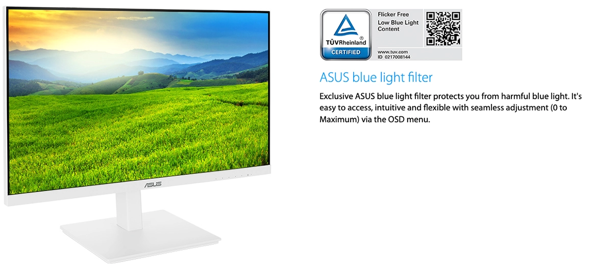 ASUS VA27DQSB-W сертифікований TÜV Rheinland за низький рівень синього світла та оснащений технологією Flicker-Free , яка усуває мерехтіння. Ці рішення знижують навантаження на очі та мінімізують втому навіть при тривалій роботі або навчанні за монітором.