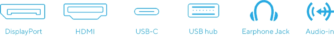 Монітор оснащений різноманітними портами для зручної роботи з будь-якими пристроями: DisplayPort, HDMI, USB-C, USB Hub та аудіороз'ємами для навушників та мікрофона.