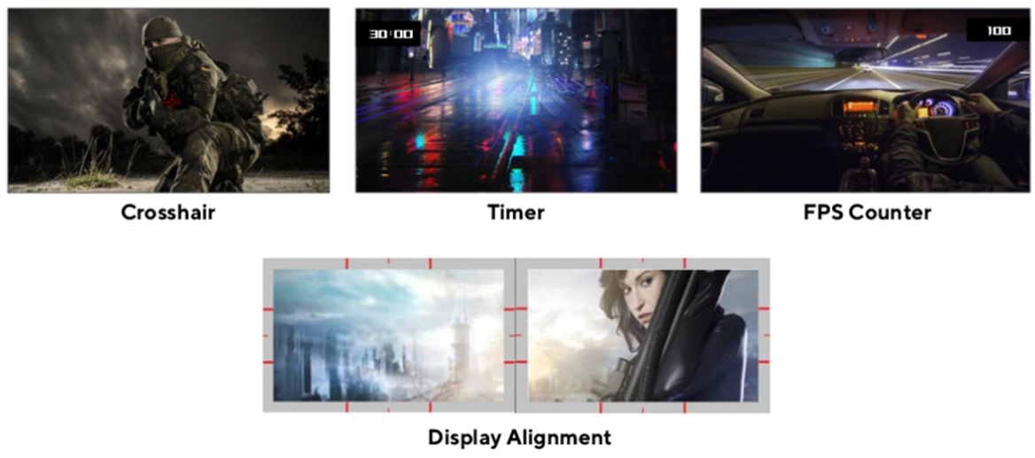 Функція ASUS GamePlus додає корисні оверлеї прямо на екран: приціл, таймер, лічильник FPS та сітку вирівнювання дисплеїв. Ці інструменти допомагають точніше прицілюватись, стежити за часом матчу та зручно вибудовувати кілька моніторів.