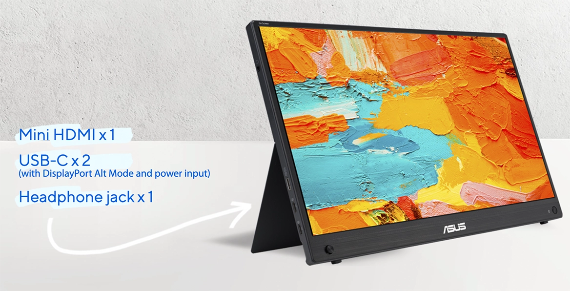 ASUS ZenScreen MB16AHG має два порти USB-C (з підтримкою DisplayPort Alt Mode та живлення), Mini HDMI , а також роз'єм для навушників. Така універсальність дозволяє підключати монітор до ноутбуків, смартфонів, ігрових консолей та інших пристроїв без жодних труднощів.