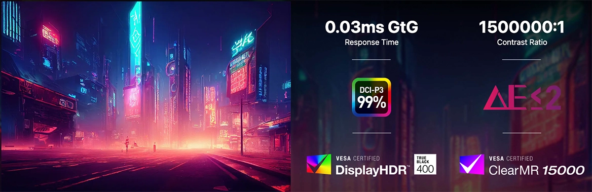 Сертифікація VESA DisplayHDR True Black 400 та охоплення колірного простору DCI-P3 на рівні 99% гарантують неймовірну глибину чорного та насиченість відтінків. З точністю кольору Delta E ≤ 2 ви отримуєте реалістичне зображення, що ідеально підходить як для ігор, так і для роботи з медіаконтентом.