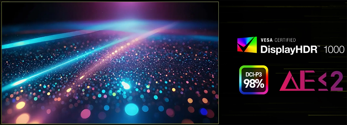 Поєднання технології Quantum Dot та сертифікації DisplayHDR 1000 дарує неймовірну яскравість та глибину контрасту. З кольоровим охопленням 98% DCI-P3 та точністю кольору Delta E≤2 монітор відтворює насичені, живі кольори, забезпечуючи захоплюючу чіткість для ігор, творчості та розваг.