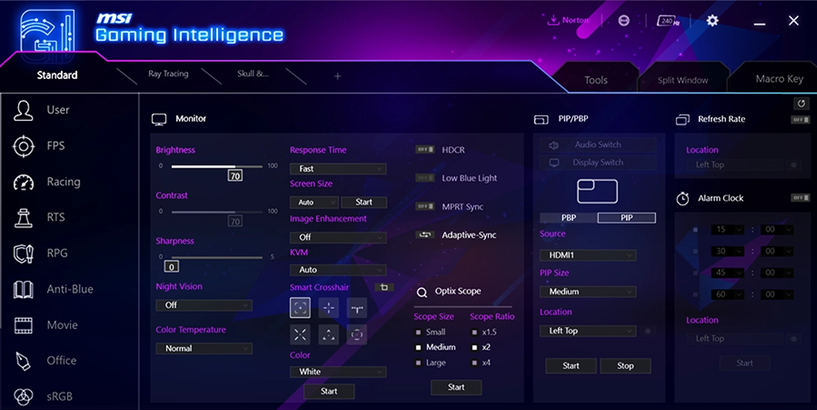 Забудьте про незручні кнопки на корпусі. Програма Gaming Intelligence дозволяє настроювати параметри монітора за допомогою клавіатури та миші. Створюйте профілі, призначайте гарячі клавіші та перемикайтеся між налаштуваннями для різних ігор за одну мить.