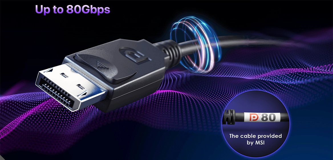 Інтерфейс DisplayPort 2.1a (UHBR20) гарантує стабільність та повну сумісність із обладнанням наступного покоління. Пропускна здатність збільшена до вражаючих 80 Гбіт/с, що у 2,5 рази перевищує показники DisplayPort 1.4a. Це дозволяє підтримувати роздільну здатність 4K при частоті 240 Гц без використання стиснення (DSC), а також повноцінно використовувати функції DSR і DLDSR.