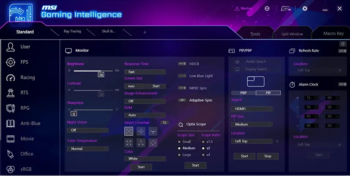 Налаштування монітора стало максимально простим завдяки додатку Gaming Intelligence. Вам більше не потрібно тягнутися до кнопок на корпусі та блукати по меню - використовуйте клавіатуру та мишу для конфігурації пристрою. Програма також дозволяє призначати гарячі клавіші для швидкого перемикання профілів між різними іграми.