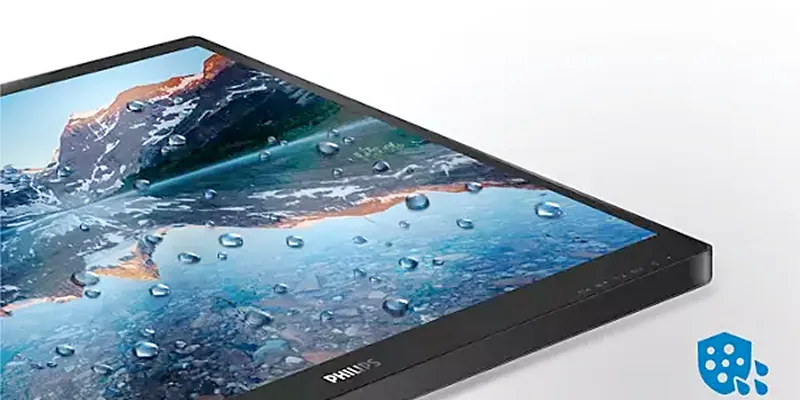 Передня панель монітора відповідає класу захисту IP54, що гарантує стійкість до пилу та бризок води. Таке рішення робить монітор придатним для використання в складніших умовах — у громадських місцях, навчальних класах, виробничих або сервісних зонах, де потрібна підвищена надійність обладнання.