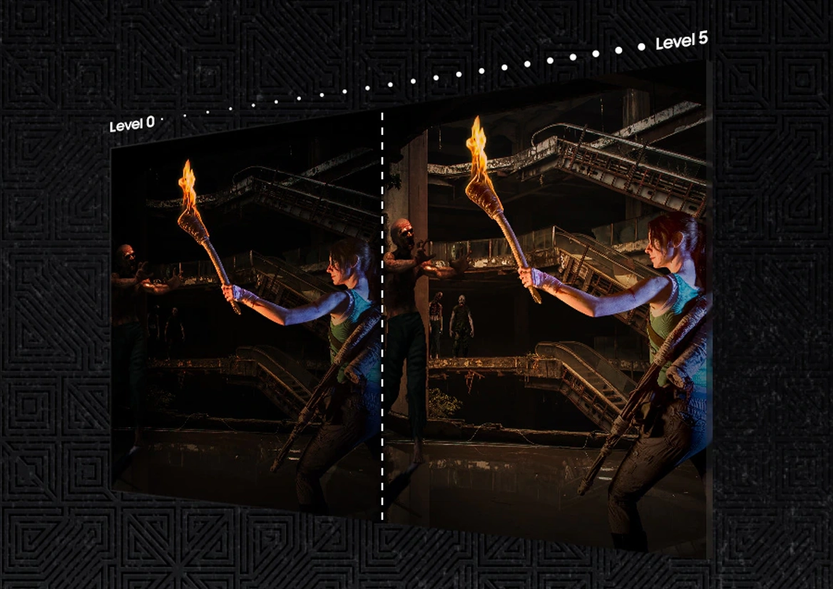 Сміливо поринайте в тінь. Динамічний еквалайзер чорного аналізує яскравість ігрових сцен та автоматично регулює різкість, насиченість та деталізацію чорних відтінків. Отримайте чіткіше зображення без зайвих налаштувань.