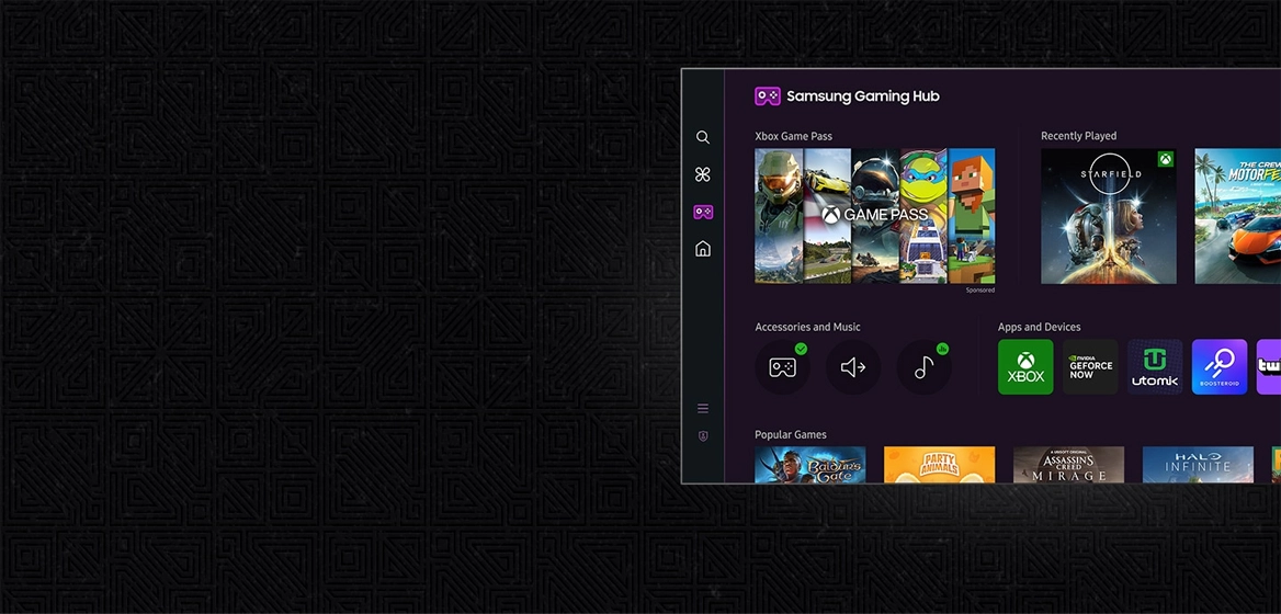 Gaming Hub забезпечує миттєвий доступ до ваших улюблених стрімінгових ігрових сервісів та консолей без завантажень. Насолоджуйтесь гнучким ігровим процесом із удосконаленим процесором Samsung NQ8 AI Gen3, який підтримує AI масштабування майже до 4K для більш реалістичних вражень, навіть під час потокового відтворення ігор.