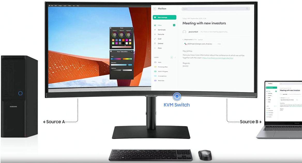 Вбудований KVM-перемикач дозволяє підключати до монітора два джерела одночасно та керувати ними за допомогою лише однієї клавіатури та миші. Ви самі вибираєте: доступні режими розділеного екрана, Picture in Picture або Picture by Picture. Працюйте ефективніше і позбавтеся клопоту з кількома пристроями завдяки простому перемиканню входів та багатозадачності.