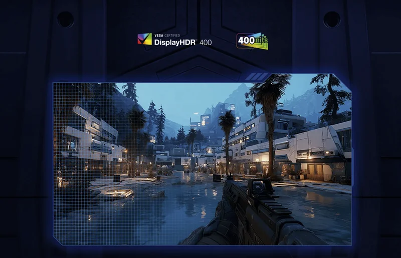 Технологія HDR400 розширює динамічний діапазон яскравості, роблячи темні ділянки ще глибшими, а світлі — яскравішими. Завдяки піковій яскравості в 400 ніт посилюється контраст між світлими і темними ділянками, забезпечуючи чіткий огляд кожної деталі на екрані.