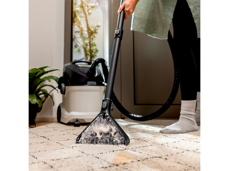 Висока ефективність прибирання у поєднанні з ергономічністю та багатофункціональністю: миючий пилосос SE 5, що відрізняється привабливим дизайном, забезпечує ретельне, глибоке очищення різноманітних текстильних матеріалів – килимів та килимових підлогових покриттів, оббивки м'яких меблів та автомобільних сидінь, матраців, стінних ков. буд. Чудовий результат чищення гарантує випробувана технологія екстракції: мийний розчин, що готується шляхом добавки у водопровідну воду пропонованого Kärcher засобу для чищення килимів RM 519, під тиском розбризкується на текстильну поверхню і відразу ж збирається разом із забрудненнями, що відокремлюються. Такий апарат чудово підходить для сімей, алергіків та власників домашніх тварин. SE 5 – багатофункціональний продукт «3 в 1», який завдяки широкому набору приладдя може використовуватися як повноцінний господарський пилосос. Іншими його особливостями є система 2 резервуарів зі знімними баками для чистої та брудної води, ергономічна ручка для перенесення та можливість зберігання приладдя на корпусі. Простота очищення миючого пилососа після прибирання сприяє продовженню терміну його служби.