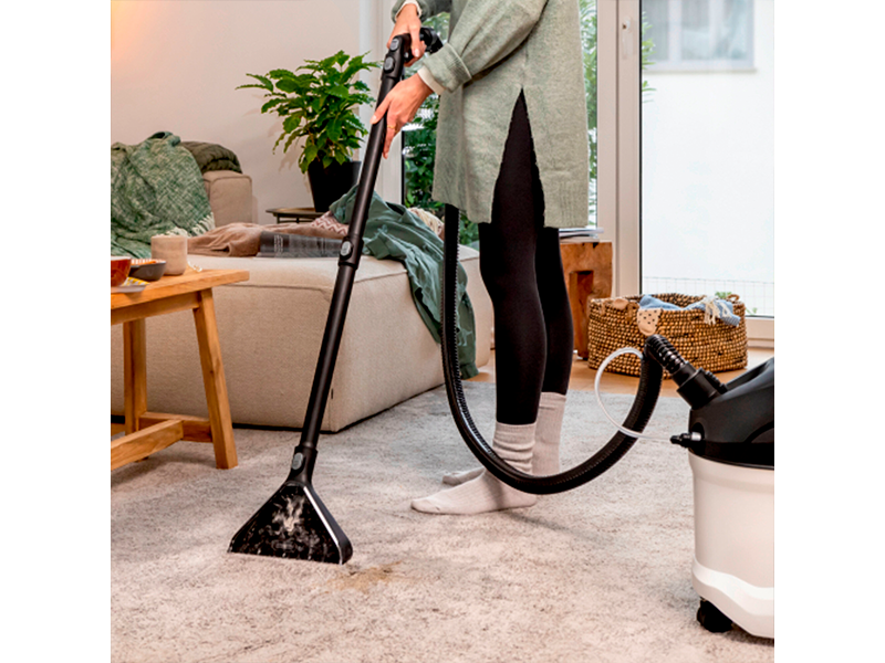 Всмоктувальний шланг із прикріпленою трубкою для подачі води підвищує зручність прибирання. Довгий еластичний шланг для всмоктування для зручності роботи. Рукоятка з функцією фіксації важеля для тривалої безперервної обробки текстильних поверхонь великої площі розчином засобу для чищення.