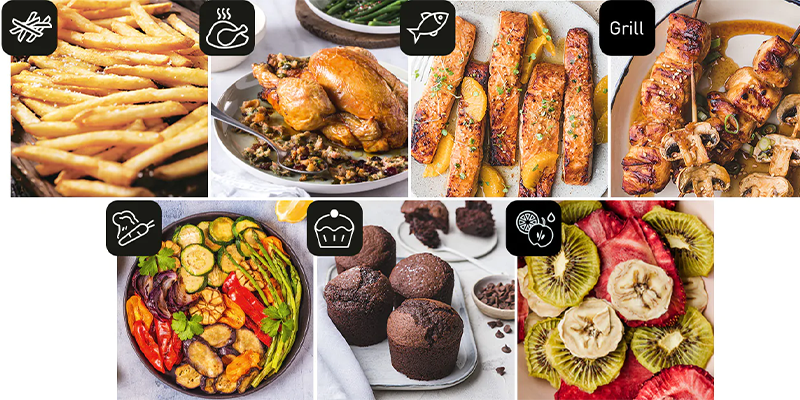 З легкістю приготуйте різні страви завдяки 7 програмам автоматичного приготування (картопля фрі, курка, овочі, риба, десерт, дегідратація, гриль + ручний режим).