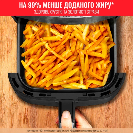 Технологія Extra Crisp оптимізує потоки повітря для отримання хрустких, золотистих страв зовні, м'яких і соковитих усередині з невеликим додаванням олії або без її використання – насолоджуйтесь найсмачнішими стравами з додаванням олії на 99% менше, ніж за звичайної смаження!