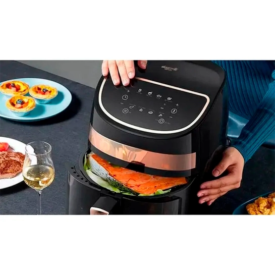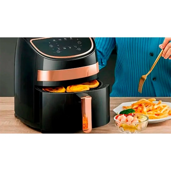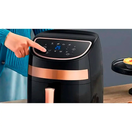 Корпус пристрою оснащений чітким сенсорним дисплеєм, що дозволяє керувати аерофрітюрницею одним торканням пальця.