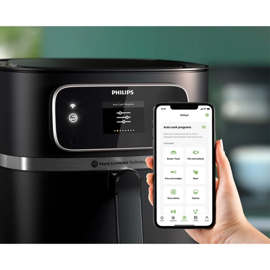 Приготування з підказками: готуйте смачні страви без зайвих зусиль, підключіть аерогриль Combi до HomeID. Вибирайте з великої кількості страв з усього світу, дотримуйтесь підказок HomeID і навіть вивантажуйте власні рецепти!