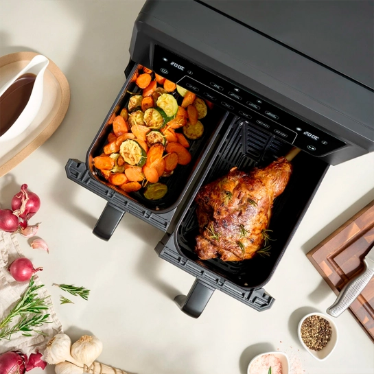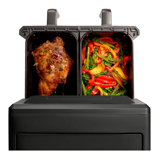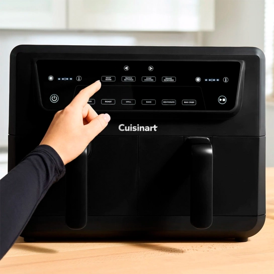 Сніданок для дитини, сімейна вечеря, святковий стіл на зустріч із друзями – все можна готувати з мультипічкою Cuisinart AIR-TWIN 10.4L AFD10OBLE. Два незалежні кошики 5.2 л кожен готують одночасно чи синхронно. Функція Sync Finish завершує обидві страви одночасно, щоб усе було гарячим до столу. Вибирайте різні режими: Max Crisp для хрусткої курки, Bake для мафінів до кави, Roast для риби, Reheat замість мікрохвильової печі, Dehydrate для домашніх чіпсів або овочевих снеків. Температура регулюється в межах 40-240 ° C, а потужність 2400 Вт дозволяє не очікувати на розігрів. Панель керування сенсорна, інтерфейс інтуїтивний, очищення - легко: обидва кошики і решітки підходять для миття в посудомийній машині.