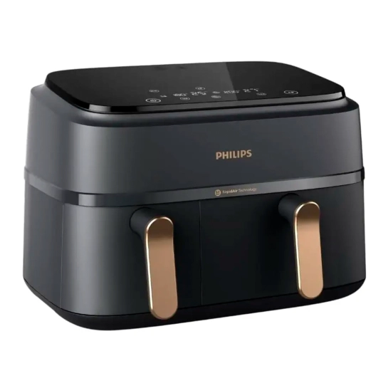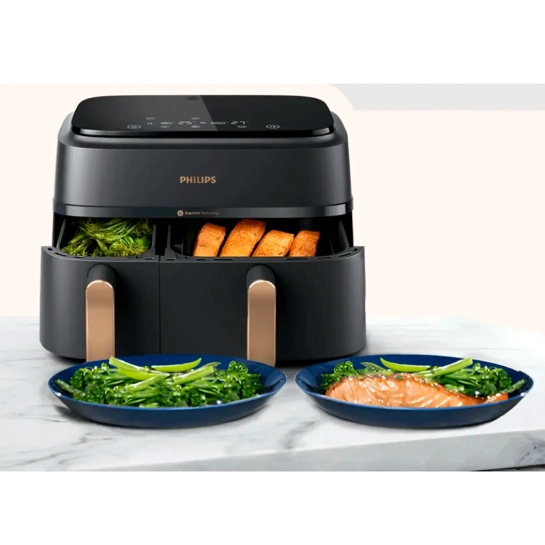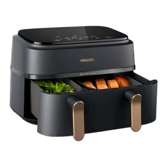 Більше ніяких спроб і помилок. Сенсорний дисплей дозволить вибирати на аерогрилі з двома кошиками попередні налаштування температури та часу для свіжої та замороженої картоплі фрі, курки, м'яса, овочів, риби, випічки та підігріву їжі.