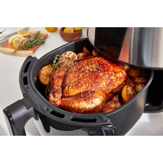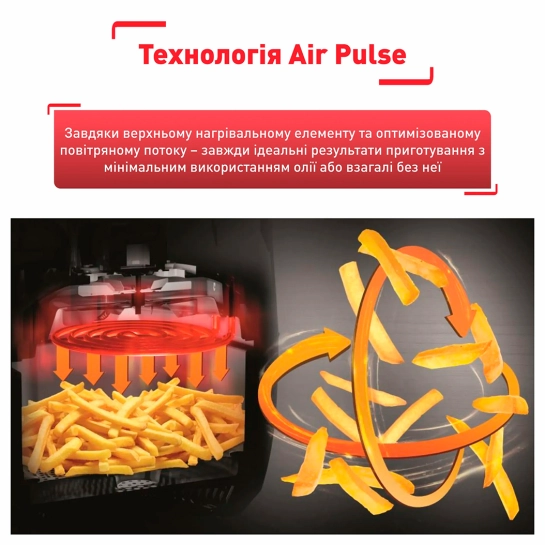 Оснащена технологією Air Pulse, що працює з використанням верхнього нагрівального елемента та оптимізованого повітряного потоку – для отримання чітких зовні та ніжних усередині результатів з мінімальним використанням олії або взагалі без нього.