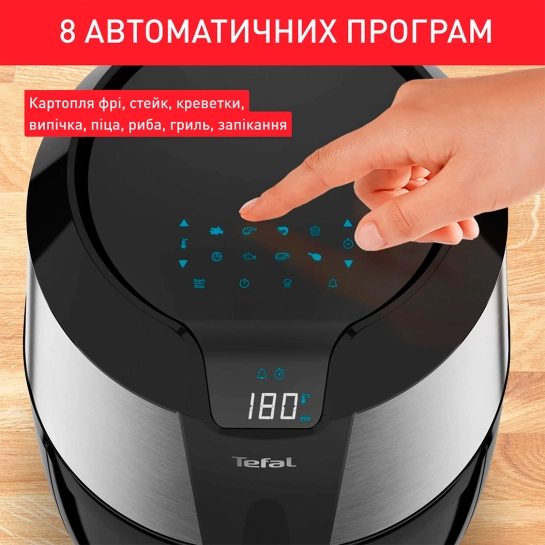 Готуйте найсмачніші страви завдяки 8 встановленим програмам: картопля фрі, стейк, креветки, тістечка, піца, риба, гриль, печеня.