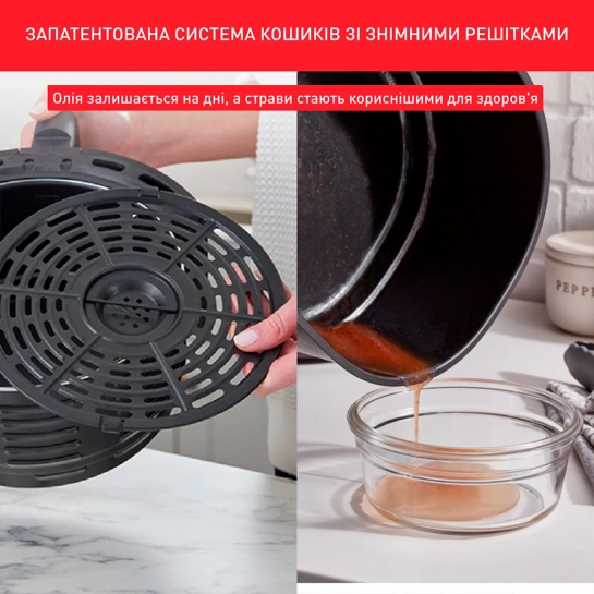 Запатентована система кошиків зі знімними решітками допомагає збирати олію з дна, забезпечуючи корисніші для здоров'я страви.