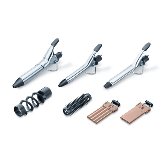 Багатофункціональний мультистайлер для укладки волосся. Сім знімних насадок для випрямлення та завивки волосся, гофрованих хвиль та спіральних локонів. Керамічне покриття захищає волосся від впливу високих температур, шарнірне з'єднання - для зручного використання стайлера.