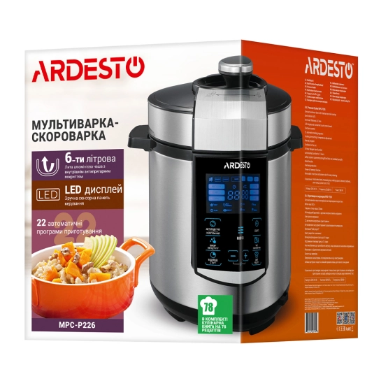 Корпус мультиварки-скороварки MPC-P226 з нержавіючої сталі з пластиковими елементами приховує гідну потужність – 900 Вт, тому процес приготування улюблених страв не буде займати багато часу. До того ж модель має мінімалістський світлодіодний дисплей та сенсорну панель управління, що визначає зручність та простоту налаштування всіх параметрів приготування. У комплекті з пристроєм надається книга рецептів, яка сповнена нових «смачних» ідей, тому точно знадобиться чи не на будь-якій кухні. Також для зручності в комплекті є мірна склянка та ложка для приготування.