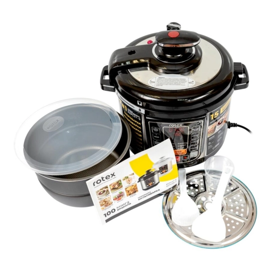 Мультиварка-скороварка Rotex REPC57-B — популярная модель, которая имеет чашу с двойным антипригарным покрытием и набор функций Smart Cooking, например: