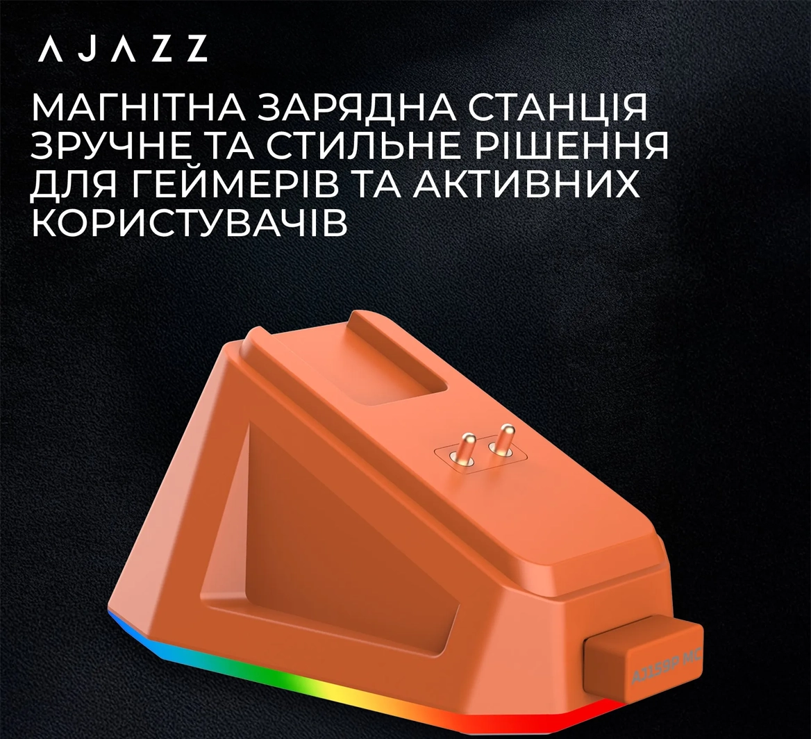 Ергономічна форма корпусу Ajazz AJ159P спроектована для комфортного використання будь-яким типом хвату. На особливу увагу заслуговує фірмова магнітна RGB док-станція , яка входить у комплект. Вона не тільки забезпечує зручну та швидку зарядку пристрою, але й служить стильним аксесуаром, додаючи атмосферне підсвічування вашому робочому столу.