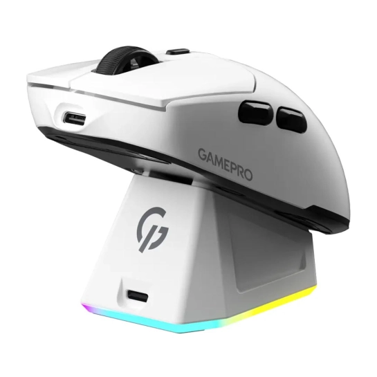 У комплект входить ексклюзивна магнітна RGB док-станція , яка не тільки забезпечує зручну та швидку зарядку, але й служить стильним аксесуаром з ефектним підсвічуванням для вашого робочого столу. За допомогою фірмового програмного забезпечення GamePro ви можете тонко налаштовувати параметри миші: змінювати рівні DPI, створювати персональні профілі та записувати складні макроси, адаптуючи девайс під свої ігрові потреби.