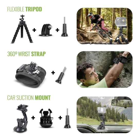 Завдяки набору додаткових аксесуарів — таких як присоска, стяжки-ремінці, набори гвинтів, базові кріплення, плоскі та вигнуті монтажні майданчики, міцні клейкі кріплення та антитуманові вставки — ви зможете адаптувати камеру під найрізноманітніші завдання: від запису екстремального спорту до зйомки сімейних поїздок.