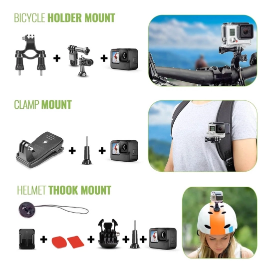 У комплект входять різноманітні кріплення для голови, грудей і зап'ястя, а також адаптери для встановлення камери на велосипедне кермо, автомобіль, шолом та інші поверхні. Кріплення на голову, груди та зап'ястя дозволяють знімати захопливі кадри від першої особи, а адаптери забезпечують надійну фіксацію навіть при активних рухах.
