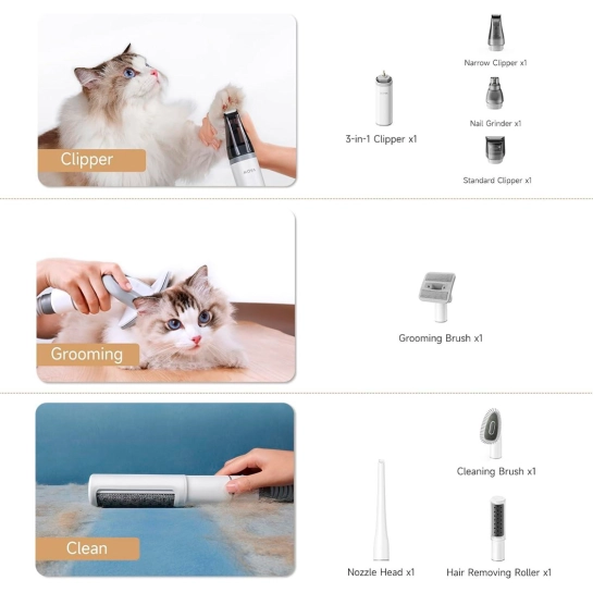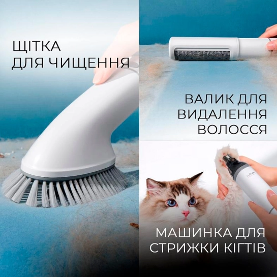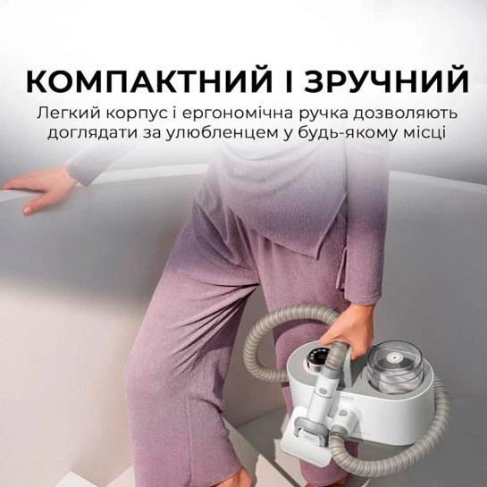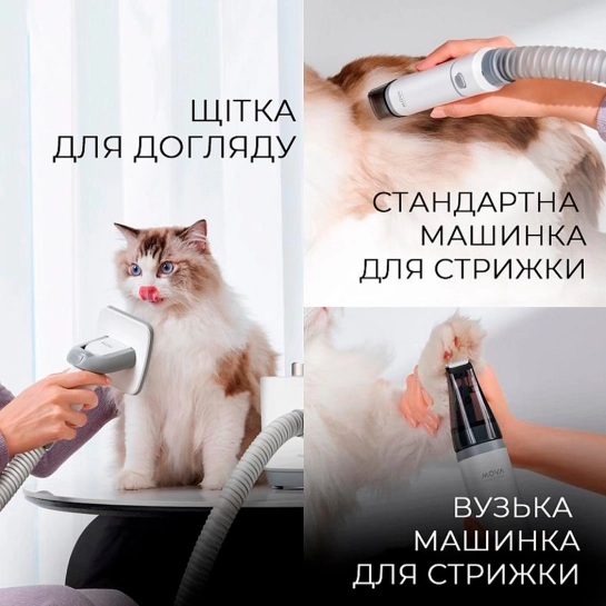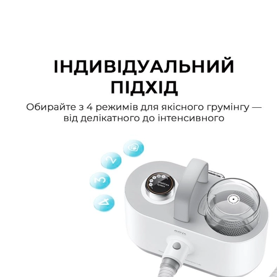 Набір для грумінгу Mova G1 Pro - це інноваційний комплект для догляду за домашніми тваринами, який поєднує 7 функцій в одному пристрої. Завдяки потужному всмоктуванню до 11 кПа та кільком рівням потужності, він ефективно видаляє шерсть та бруд, забезпечуючи чистоту вашого будинку. Пристрій має низький рівень шуму – близько 36 дБ у режимі догляду, що мінімізує стрес для вихованців. Компактний дизайн, зручна ручка та довгий мережевий кабель разом із еластичним шлангом забезпечують свободу рухів та комфортне використання. Контейнер для збирання вовни об'ємом 1 літр дозволяє проводити кілька сеансів грумінгу без необхідності частого очищення. З цим набором догляд за вашим улюбленцем стає простим, ефективним та приємним.