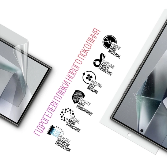 Гідрогелева плівка щільно прилягає до поверхні дисплея, повторюючи його форму та забезпечуючи повне покриття, включаючи закруглені краї. Такий матеріал однаково ефективно захищає екран при повсякденній експлуатації, зберігаючи плавність дотиків і точну реакцію на жести. Особлива структура знижує ризик появи мікропошкоджень, а ефект самовідновлення допомагає плівці залишатися свіжою та акуратною навіть через тривалий час.