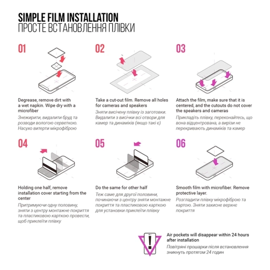 Завдяки сучасному клейовому шару плівка міцно фіксується, не утворює бульбашок і не зміщується під час використання. Установка проста і не вимагає спеціальних навичок — достатньо акуратно поєднати плівку з дисплеєм, після чого вона самостійно адаптується до поверхні. За необхідності можна легко замінити захист без слідів і ризику пошкодження екрана.