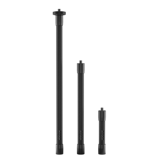 Набір із трьох міцних, але невагомих подовжувачів із вуглецевого волокна допомагає збільшити варіативність ракурсів та знімати в режимі 360°. Легко комбінуйте штанги завдовжки 10, 20 та 30 см, щоб досягти ідеальної дистанції, яка дозволить подовжувачу зникнути з кадру та залишити глядача у центрі екшену. Використовуйте їх, щоб отримати ракурси, гідні дрону, або динамічні зйомки від першої особи з кріпленням на кермі, де камера фіксує вашу реакцію. З універсальним кріпленням 1/4-20 мм та гумовою основою для швидкої фіксації ви отримуєте творчу свободу в будь-яких умовах.