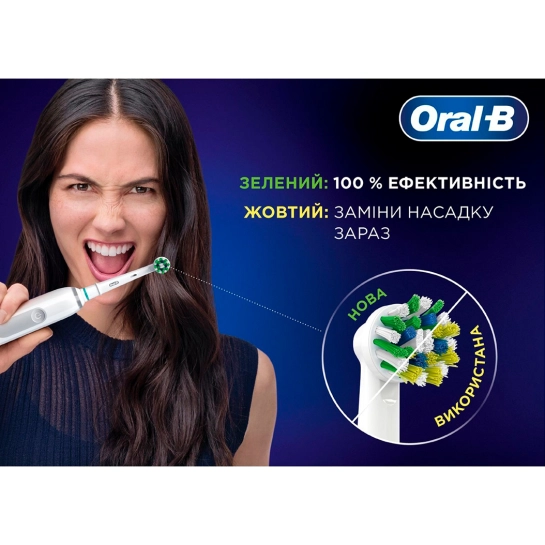 Змінна насадка Oral-B Pro Cross Action містить понад 2200 щетинок, розташованих під ідеальним кутом для видалення на 100% більше бактеріального нальоту, забезпечуючи більш ефективне чищення зубів та здоров'я ясен порівняно з традиційною зубною щіткою. Оригінальні змінні насадки зубної щітки Oral-B розроблені з новими щетинками X-подібної форми, що очищають ділянки, яких круглі змінні насадки не можуть досягти. Її індикатор використання змінної насадки: колір зелених щетинок змінюється жовтий, нагадуючи вам, коли потрібно замінити насадку для забезпечення 100% ефективності очищення. Сумісно з електричними акумуляторними зубними щітками Oral-B, крім зубних щіток Pulsonic та iO.
