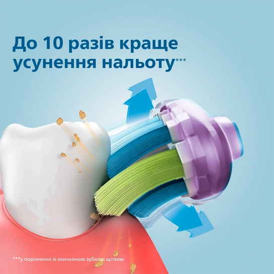 Це посилює ефект звукового чищення для більш ретельного чищення навіть у важкодоступних ділянках. Завдяки гнучкій конструкції Premium Gum Care видаляє до 10 разів більше нальоту, ніж звичайна зубна щітка.