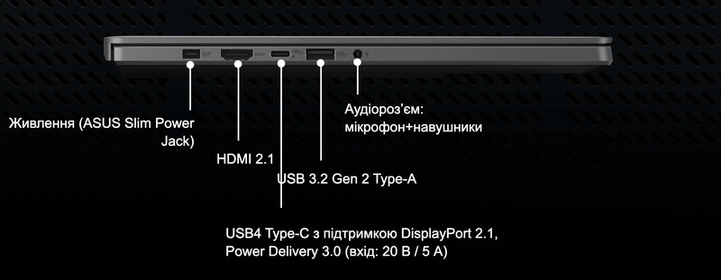 Незважаючи на тонкий і надзвичайно портативний корпус, G14 пропонує всі можливості для підключення периферії. Два порти USB-C підтримують виведення зображення на дисплей, при цьому один з портів підтримує стандарти Power Delivery 3.0 i DisplayPort 2.1, що дозволяє максимально ефективно використовувати цей універсальний роз'єм. Zephyrus G14 має по одному порту з кожного боку, тому ви можете зручно заряджати свій пристрій під час подорожі. Два порти USB 3.2 Gen2 Type-А розширюють можливості для підключення різноманітних периферійних. Для швидкого перенесення файлів або додавання додаткового накопичувача завжди готовий швидкісний картридер.