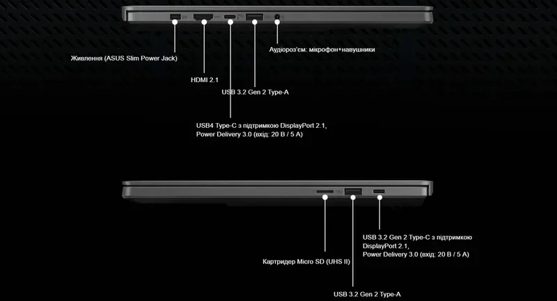 - USB 3.2 Gen 2 Туре-С з підтримкою DisplayPort 2.1, Power Delivery 3.0 (вхід: 20 B/5 A).