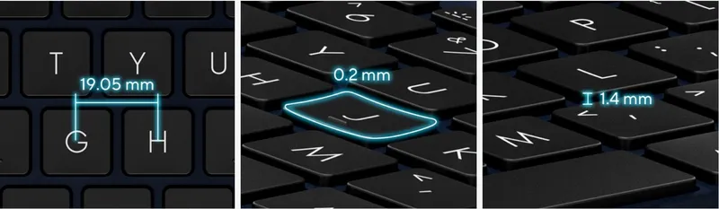 0,2-мм заглиблення на ковпачках клавіш спроєктовані таким чином, щоб форма клавіш відповідала формі кінчиків пальців: така форма ніжно спрямовує палець до ідеальної точки контакту з клавішею.