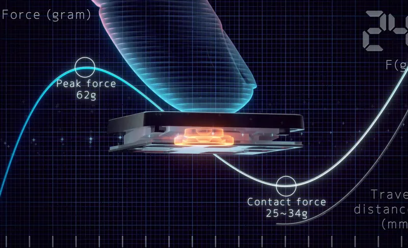 Тактильні відчуття від клавіатури залежать від співвідношення між граничною силою (також відомою як сила натиску) і силою контакту. Гранична сила виникає, коли ви натискаєте на клавішу та досягаєте максимальної сили, яку гумовий ковпачок під клавішею може витримати без деформації. Сила контакту виникає, коли нижня частина клавіші торкається друкованої плати й генерує електронний сигнал, який запускає пов’язану з цією клавішею дію. Щоб отримати максимально природне відчуття від клавіатури, профільні експерти ASUS науковим шляхом визначили, що оптимальне для ергономіки співвідношення цих сил становить 45–60%. Ці сили точно вимірюються та регулюються за допомогою розроблених ASUS гумових ковпачків під клавішами.