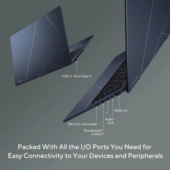 Ноутбук Zenbook 14 укомплектований усіма інтерфейсними портами, необхідними для легкого підключення ваших пристроїв і периферійного обладнання. Найсучасніші швидкісні порти Thunderbolt 4 у вигляді роз'ємів USB-C підтримують швидку зарядку, дозволяють підключати зовнішні дисплеї 4K UHD і передавати дані зі швидкістю до 40 Гбіт/с, а крім того, ноутбук оснащений портом HDMI, портом USB 3.2 Gen 2 Type-A і кардрідером формату microSD. Для зв'язку і підключення звукового обладнання передбачений зручний комбінований аудіороз'єм.